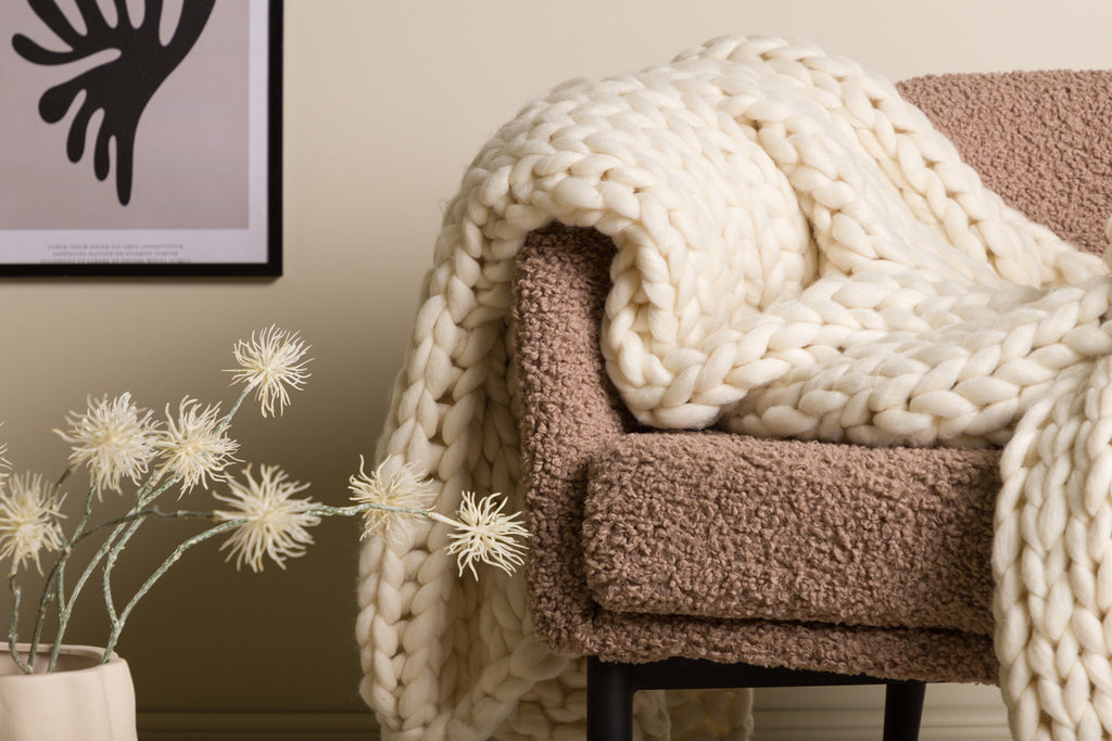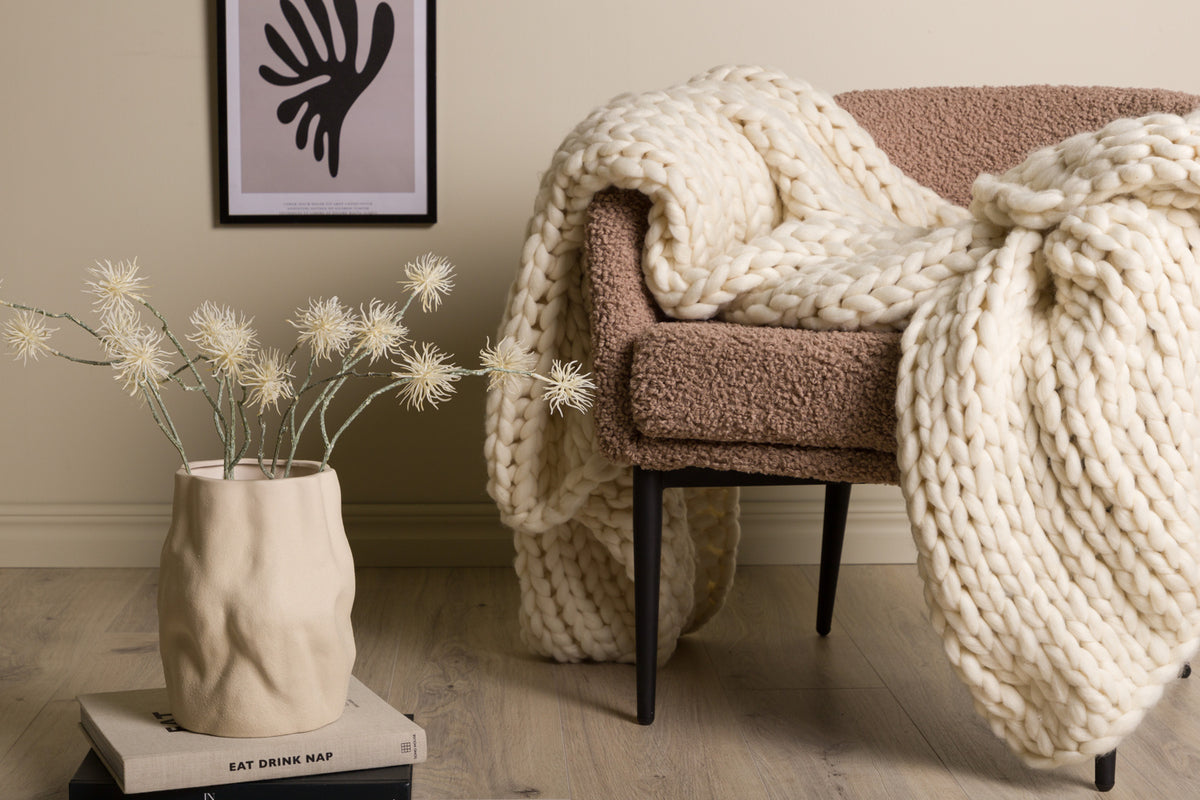 Kate er et blødt, strikket tæppe i tykt polyestergarn, der kombinerer varme med et dekorativt udtryk. Den chunky strik og bløde tekstur gør det perfekt til sofaen, lænestolen eller sengen – ideelt til hyggestunder med en kop te og din yndlingsserie. En komfortabel og stilren detalje i hjemmet, som hurtigt bliver hele familiens favorit.