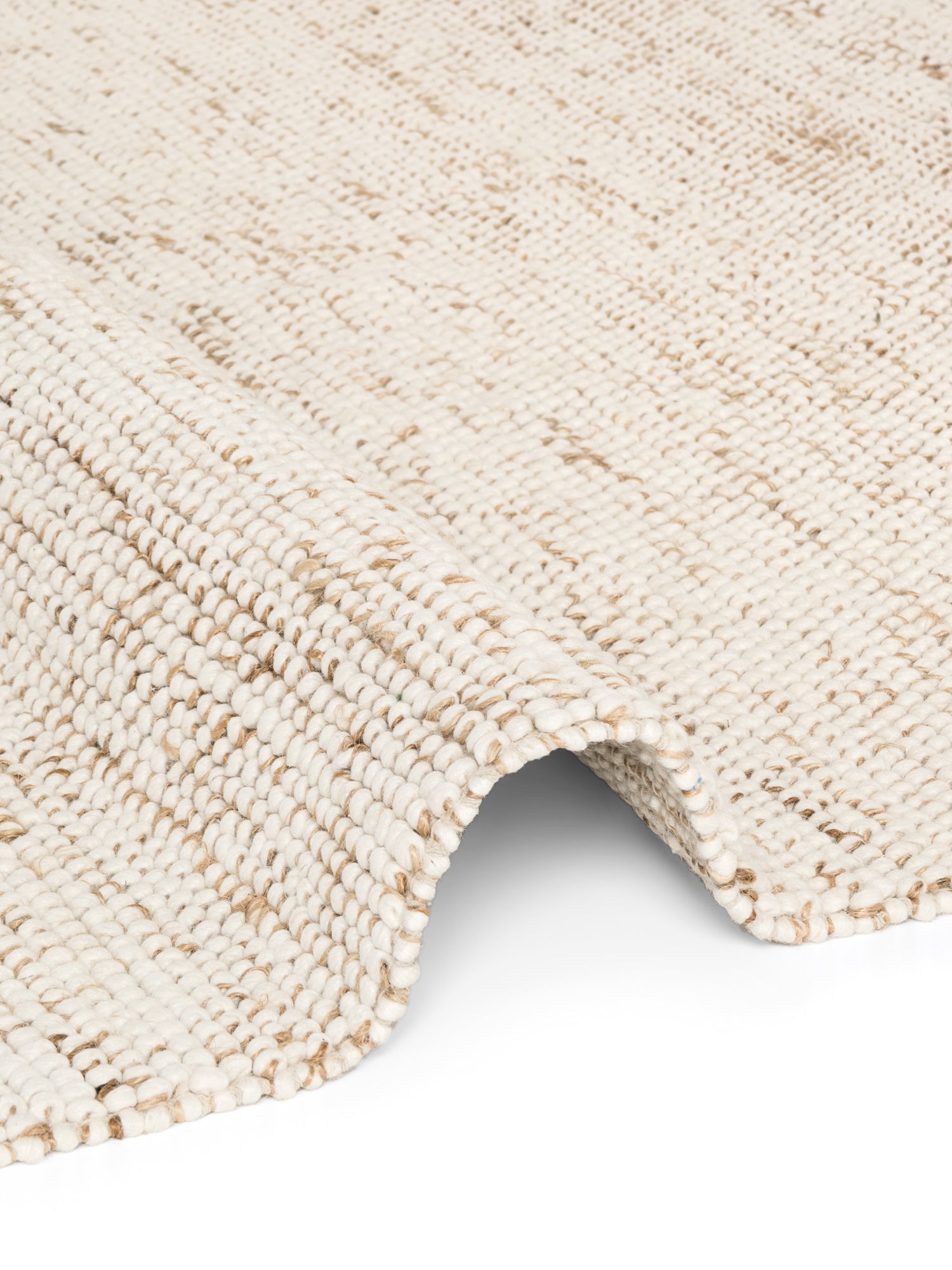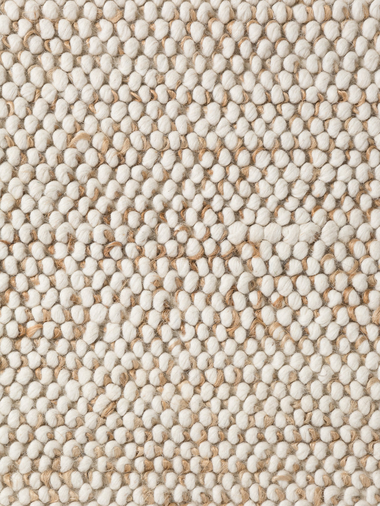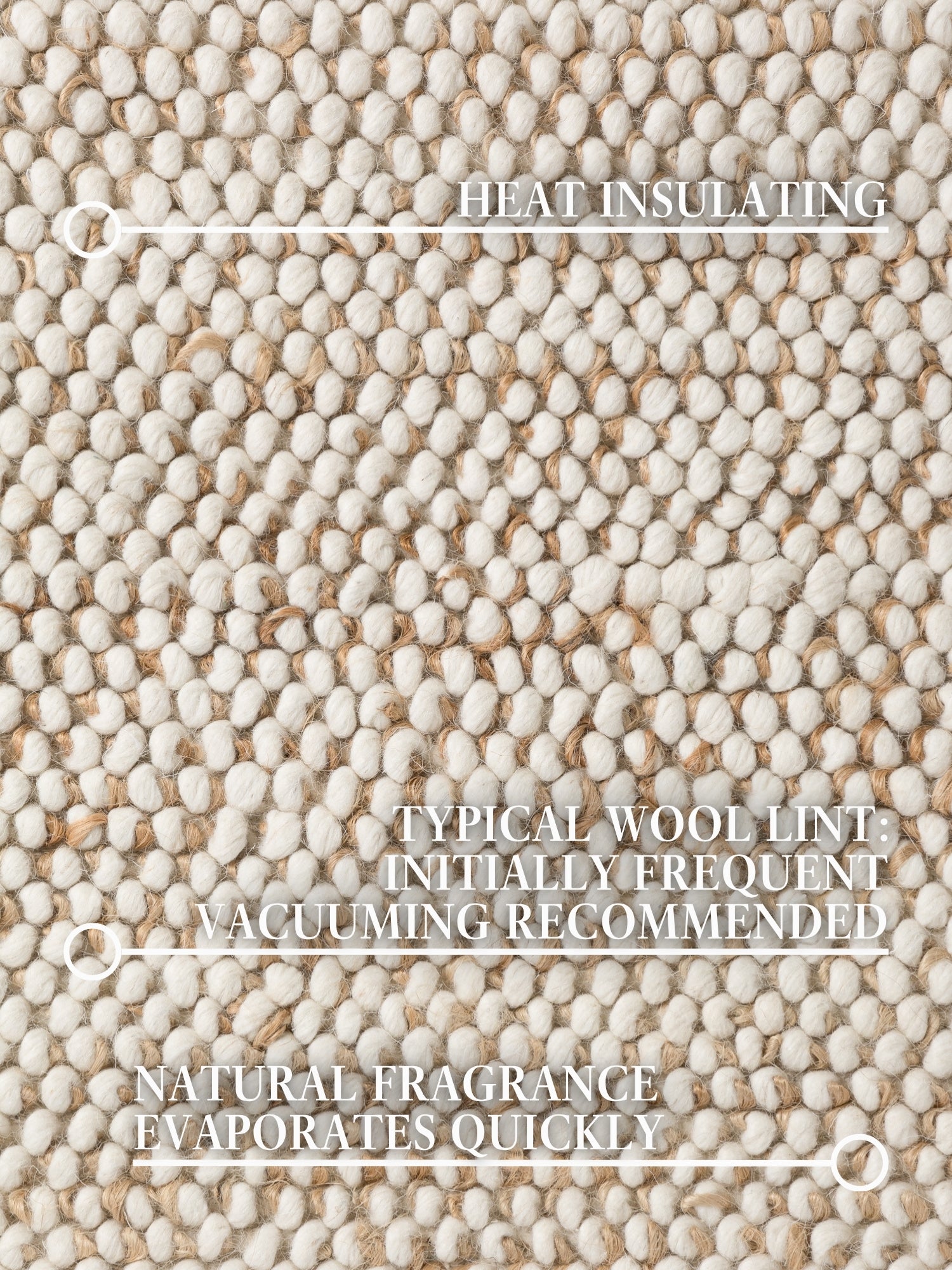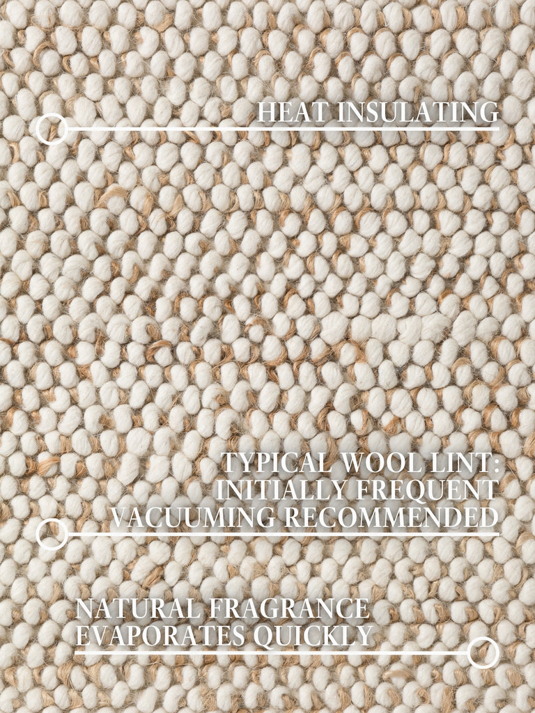 Ullens naturliga egenskaper säkerställer hög hållbarhet och ett exklusivt utseende, medan jute och bomull ger textur och karaktär. Fibrerna kan lossna lite i början – regelbunden dammsugning säkerställer att mattan håller sig vacker i många år framöver.