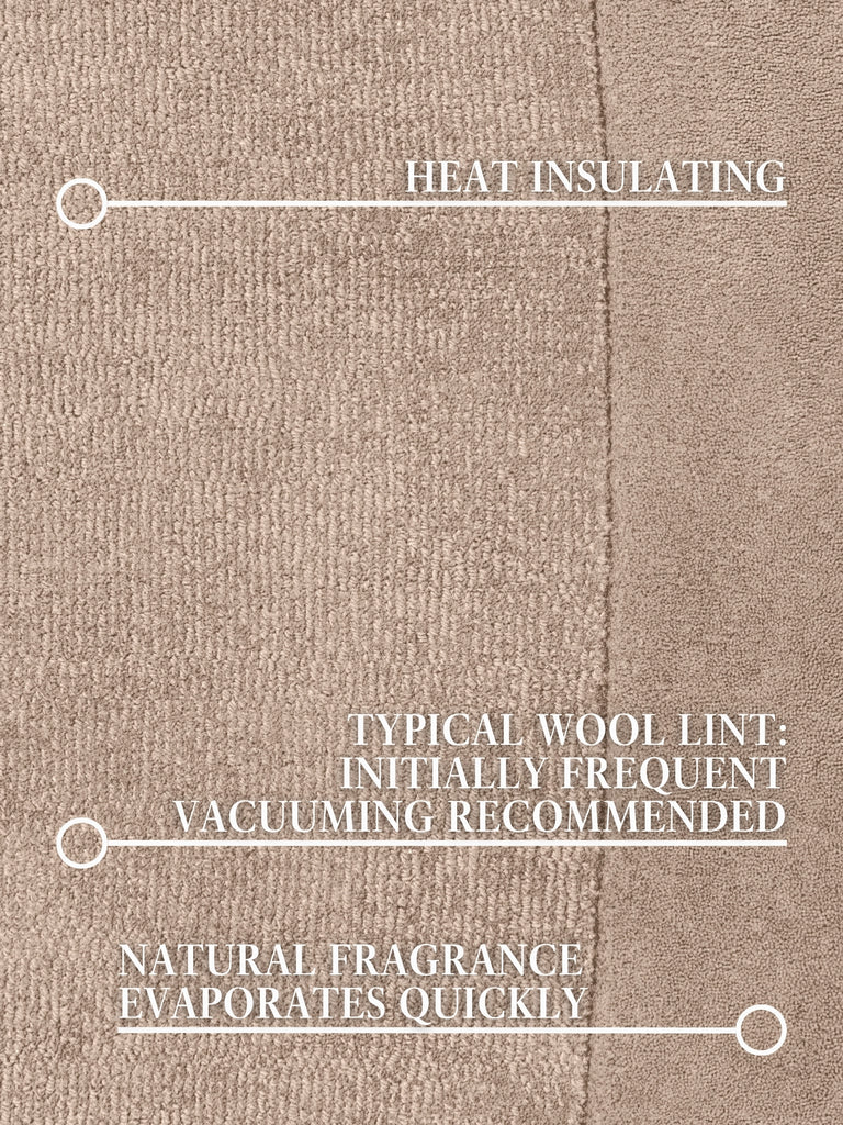 Inledningsvis kan det finnas lösa fibrer, vilket är normalt för nya ullmattor. Regelbunden dammsugning minskar löshet över tid och hjälper till att bibehålla mattans vackra utseende.