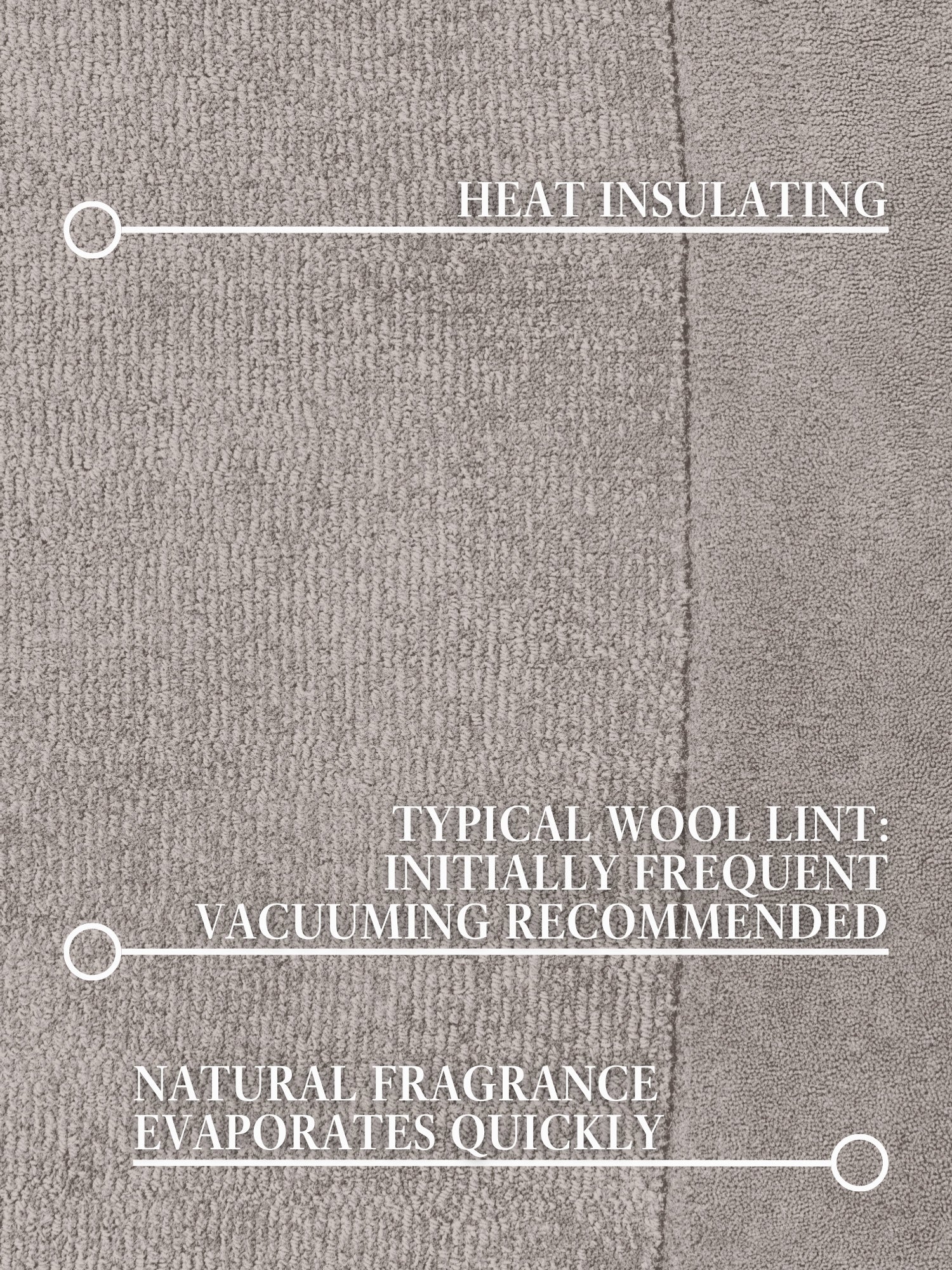 Inledningsvis kan det finnas lösa fibrer, vilket är normalt för nya ullmattor. Regelbunden dammsugning minskar löshet över tid och hjälper till att bibehålla mattans vackra utseende.