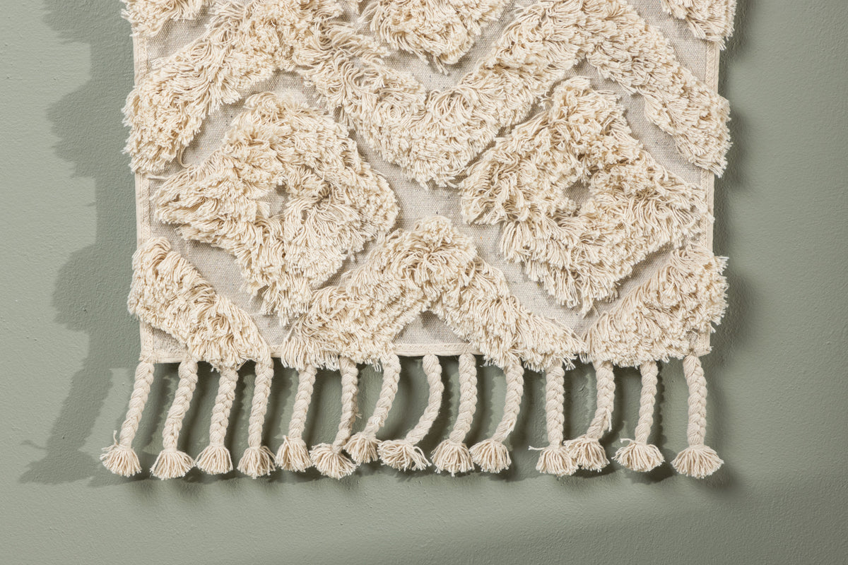 Hilda er et dekorativt vægtæppe i off white med et smukt mønster, der giver rummet liv og charme. Det bløde bomuldstæppe har lang luv og en elegant fletkant nederst, som tilfører stil og varme. Hæng Hilda op på væggen for at skabe en unik og hyggelig atmosfære i dit hjem.