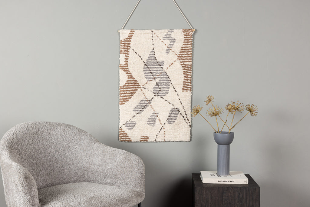 Skab en varm og indbydende stemning i dit hjem med vægtæppet Liam. Tæppet er fremstillet af blød bomuld og fås i tidløse farver som grå, brun og elfenben, der passer ind i de fleste hjem. Det smukke, mønstrede design giver væggen liv og personlighed, samtidig med at det tilfører rummet en hyggelig og elegant atmosfære.