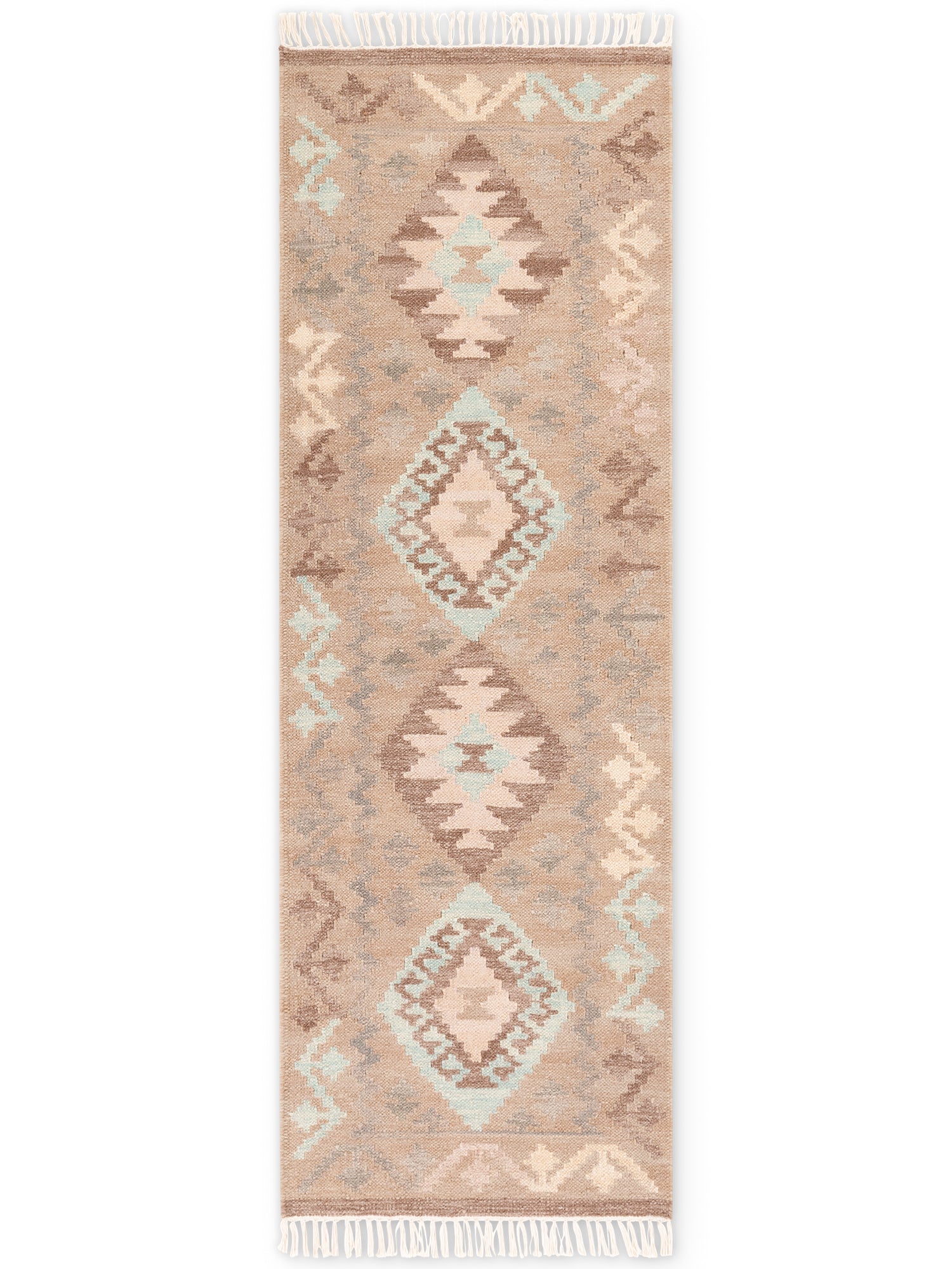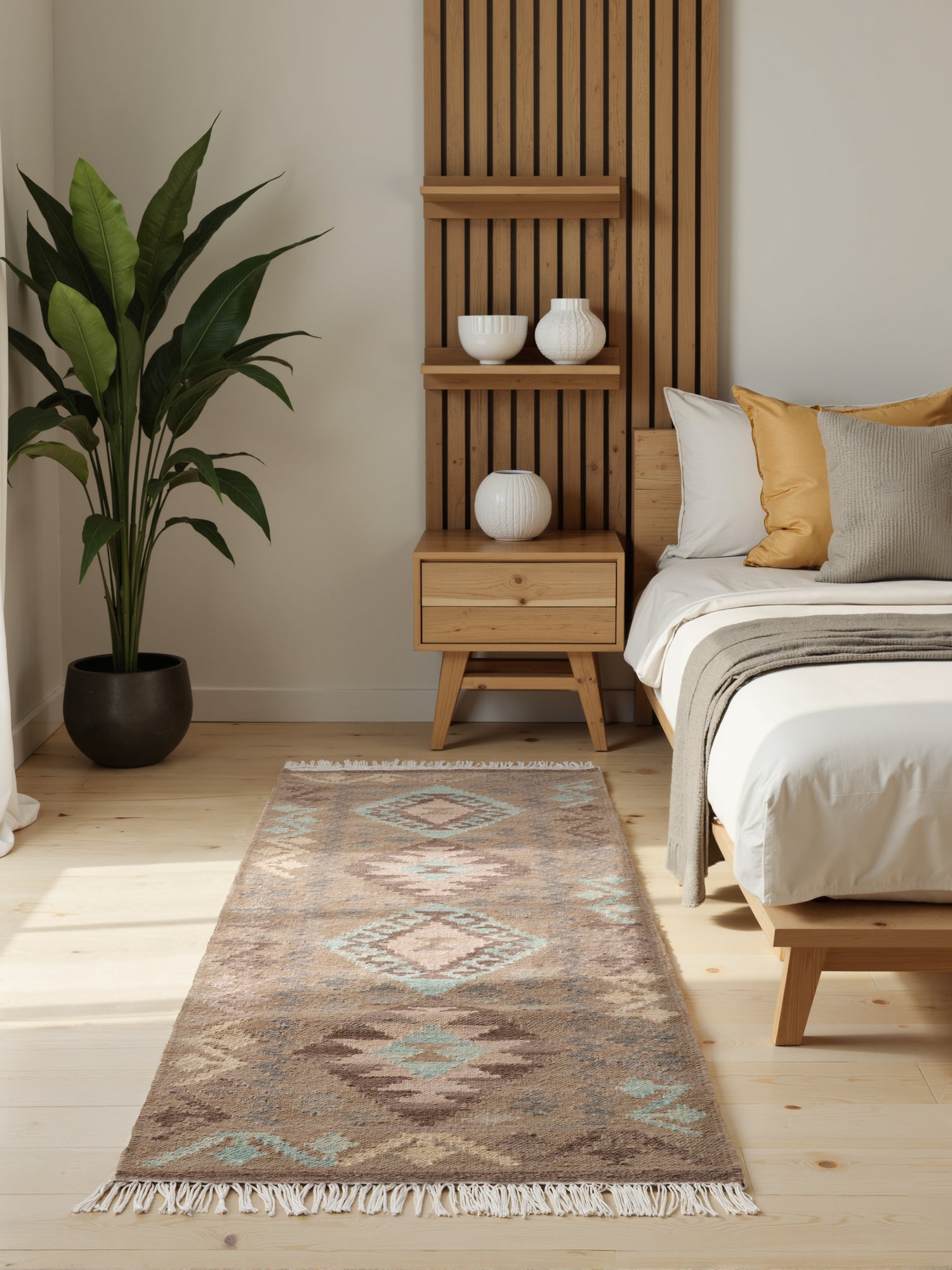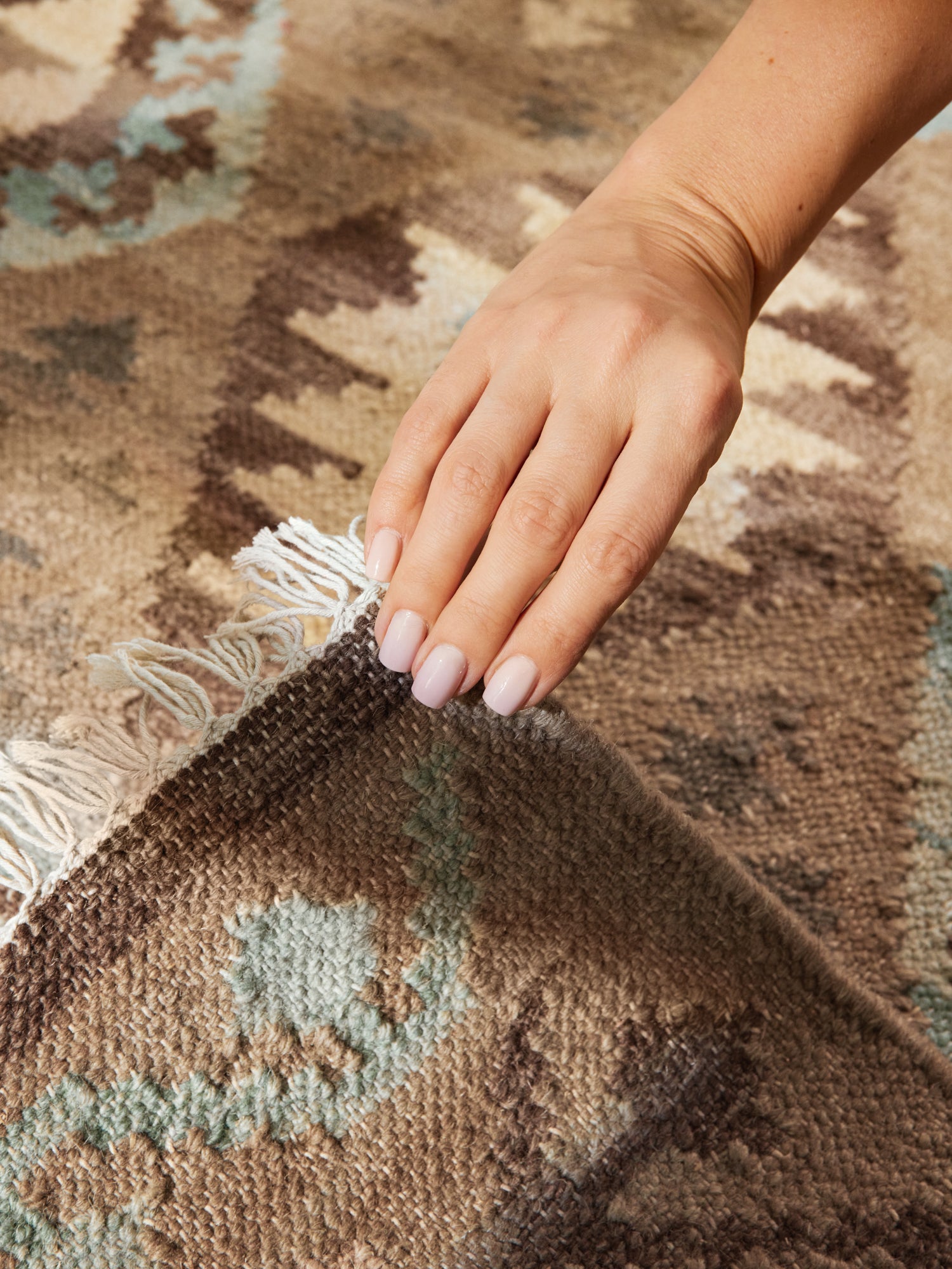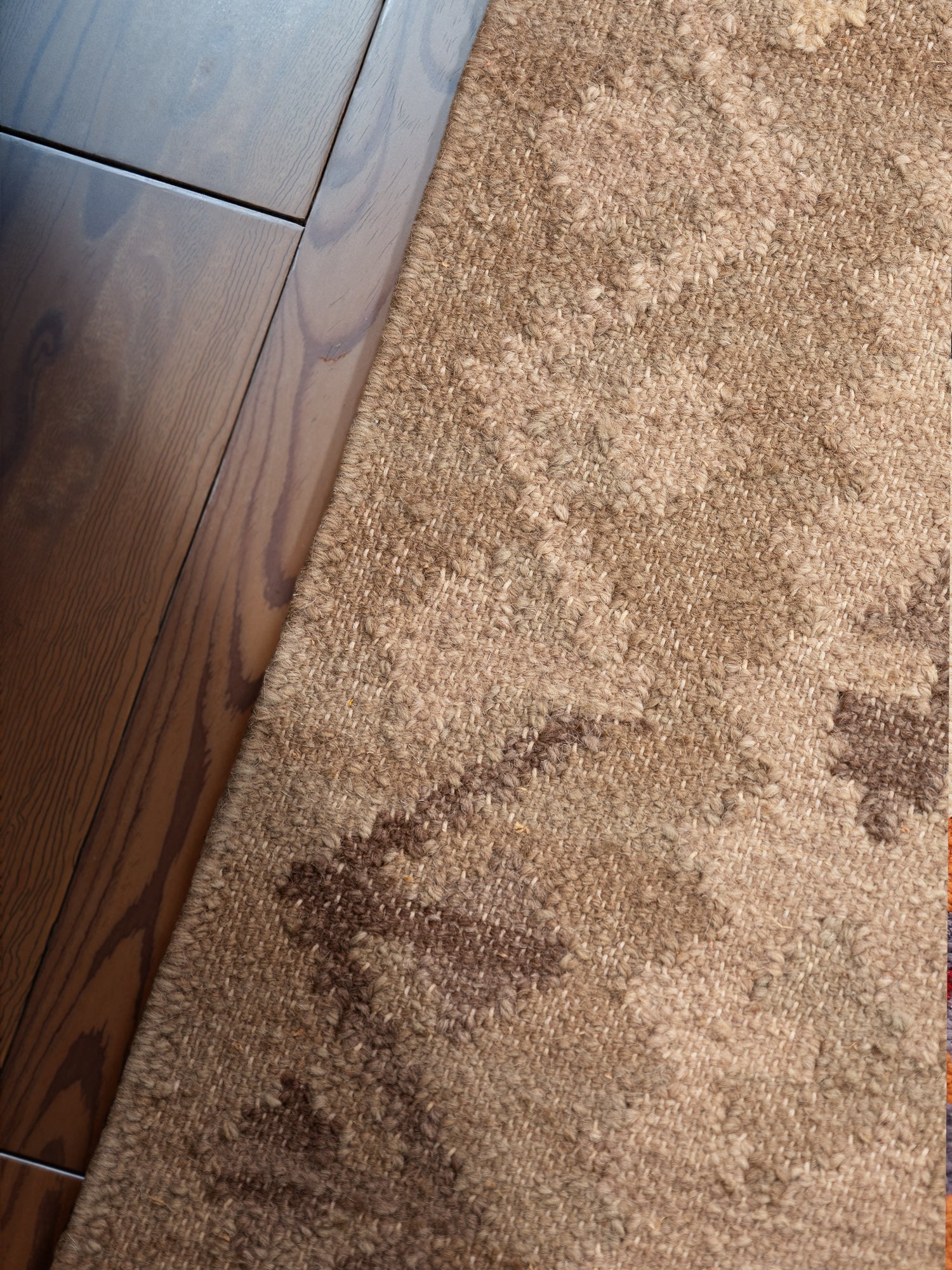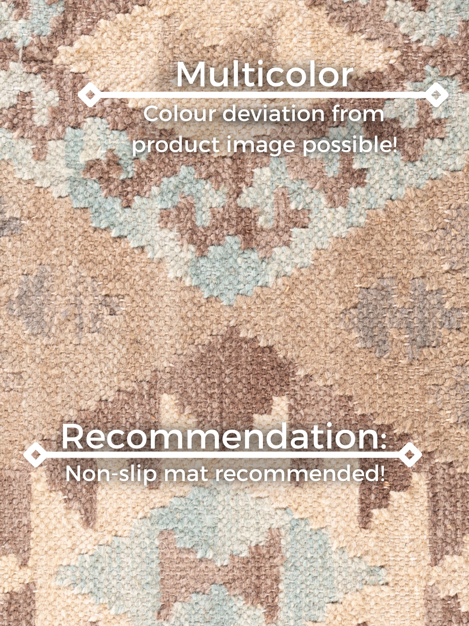 Mattan är handvävd av 80 % ull och 20 % bomull, vilket garanterar en robust och naturlig kvalitet. Den platta väven med en lugghöjd på ca 3 mm och de kraftiga fransarna ger både komfort och lång hållbarhet – perfekt för dig som vill ha ett slitstarkt och hållbart val.