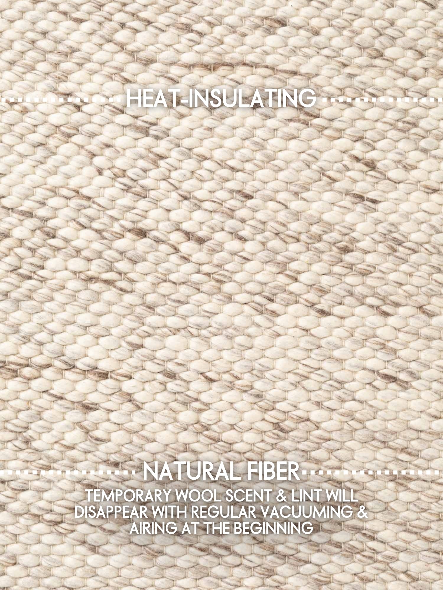 Det naturliga färgschemat och den pärlliknande texturen ger rummet en lugn och mysig atmosfär. Mindre färgvariationer kan förekomma och betonar mattans autentiska och livfulla uttryck. Liksom med många ullmattor kan en lätt naturlig doft finnas när mattan packas upp, vilken kommer att blekna med tiden.