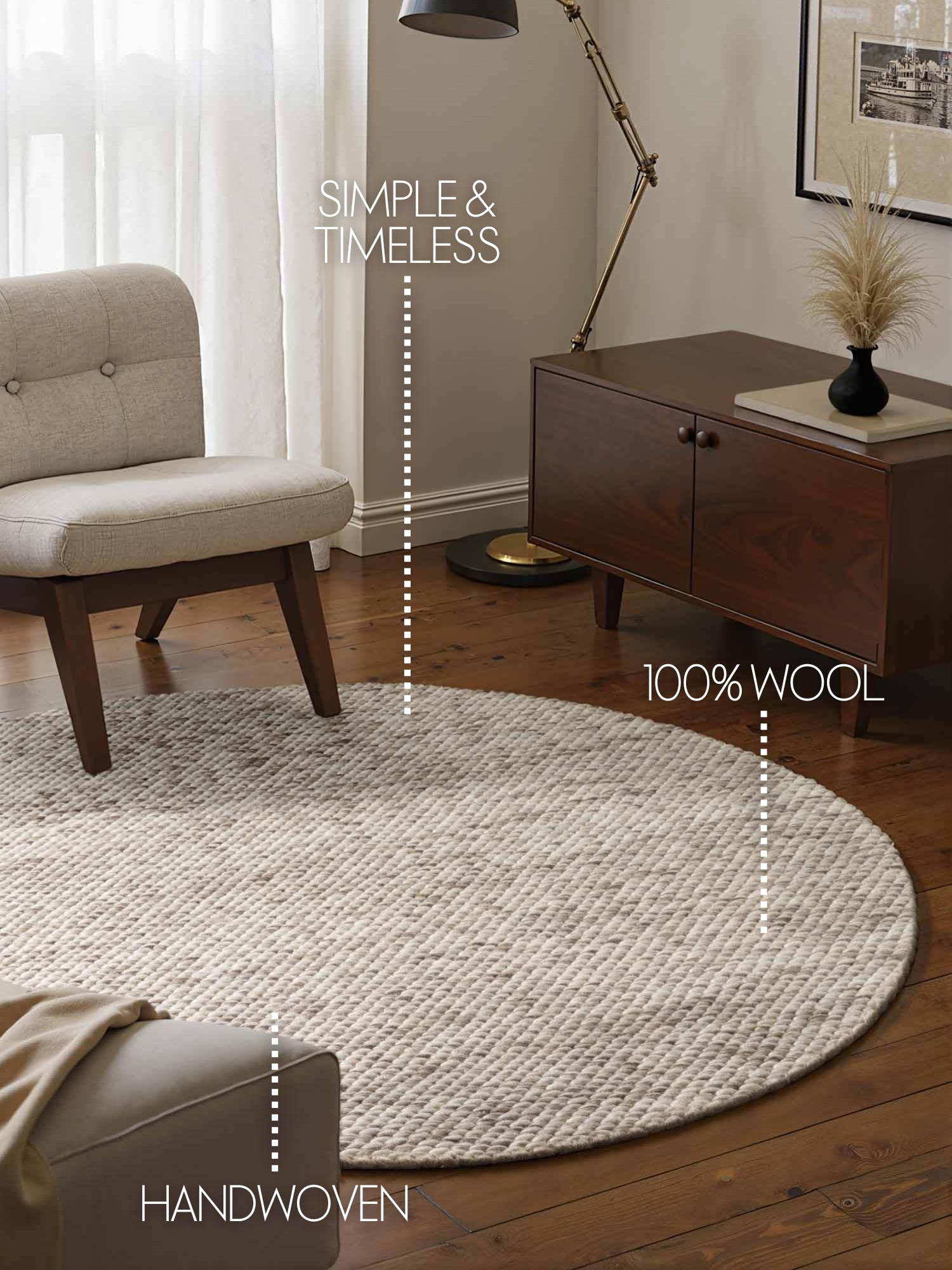 Lyon är handvävd av 100 % ull och kombinerar stil och funktionalitet. Inledningsvis kan mattan lossna lite fibrer – detta är normalt för ull och kan minskas genom regelbunden dammsugning.