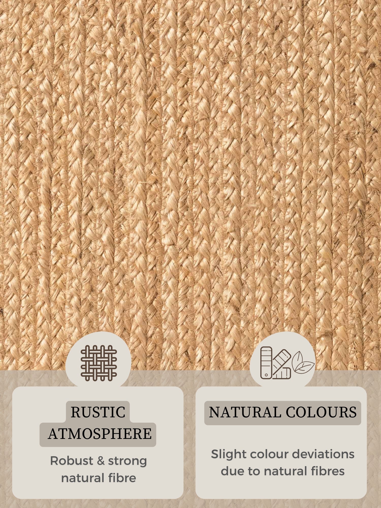 Mattan utstrålar en mysig lantlig atmosfär och är tillverkad av starka naturfibrer. Till en början kan det finnas en lätt, naturlig doft från juten, som snabbt försvinner. Därefter är scenen satt för en matta som kommer att skapa glädje i många år.