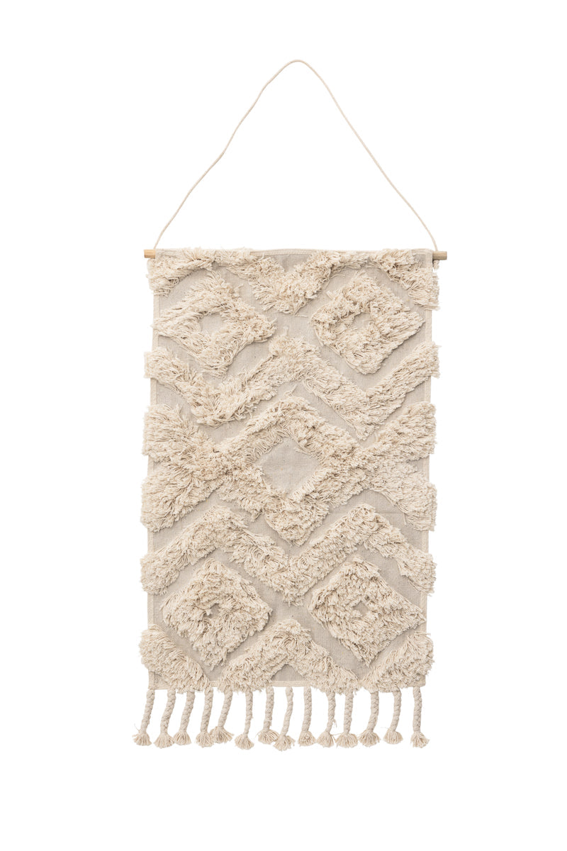 Hilda är en dekorativ väggbonad i benvitt med ett vackert mönster som ger liv och charm till rummet. Den mjuka bomullsmattan har en lång lugg och en elegant flätad kant nedtill, vilket ger stil och värme. Häng Hilda på väggen för att skapa en unik och mysig atmosfär i ditt hem.
