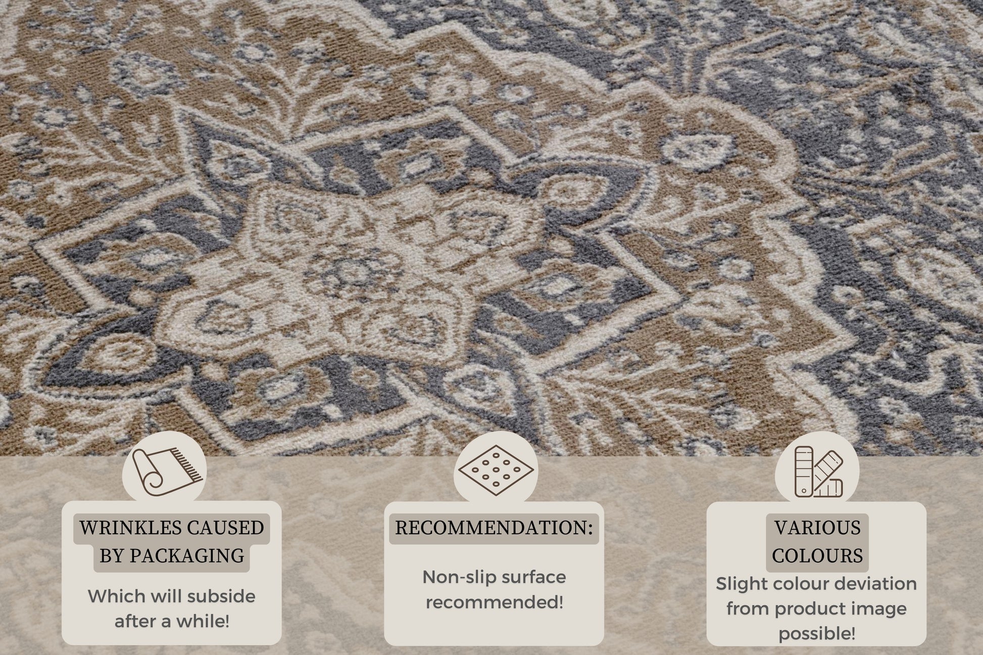 Mattan har detaljerade och tidlösa mönster som ger en klassisk elegans till alla rum. De vackra designerna skapar en varm och inbjudande atmosfär. Även om polypropen är känt för sin robusthet, erbjuder denna matta fortfarande en bekväm känsla under fötterna, vilket gör den till det perfekta valet för dig som vill ha både stil och komfort.