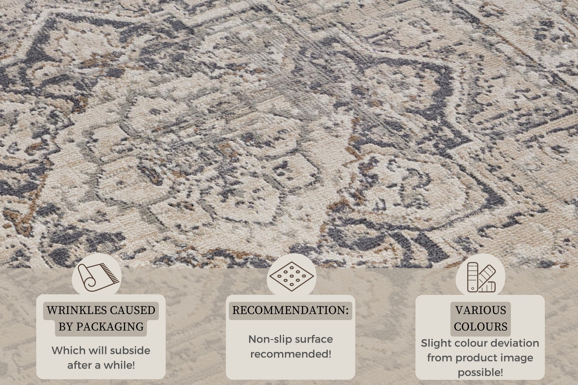 Mattan har detaljerade och tidlösa mönster som ger en klassisk elegans till alla rum. De vackra designerna skapar en varm och inbjudande atmosfär. Även om polypropen är känt för sin robusthet, erbjuder denna matta fortfarande en bekväm känsla under fötterna, vilket gör den till det perfekta valet för dig som vill ha både stil och komfort.