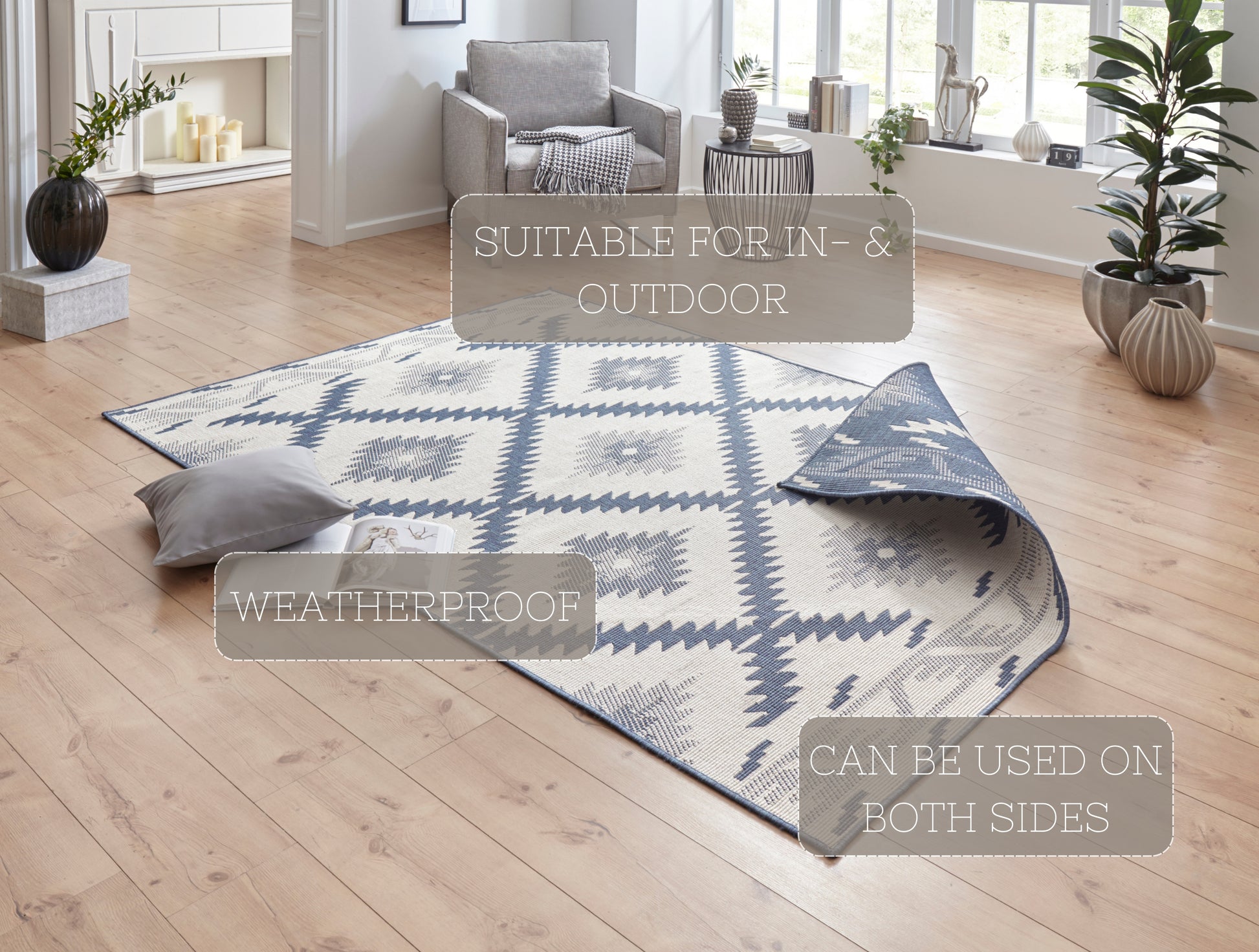 Den vändbara mattan Twin är ett mångsidigt val för alla inredningar, lämplig för både inomhus- och utomhusbruk. Denna slättvävda matta, tillverkad av 100 % polypropen, överraskar med sin vändbara design, vilket ger flexibilitet och funktionalitet till din heminredning. Den vändbara funktionen ger inte bara variation i utseende, utan förlänger också mattans livslängd.