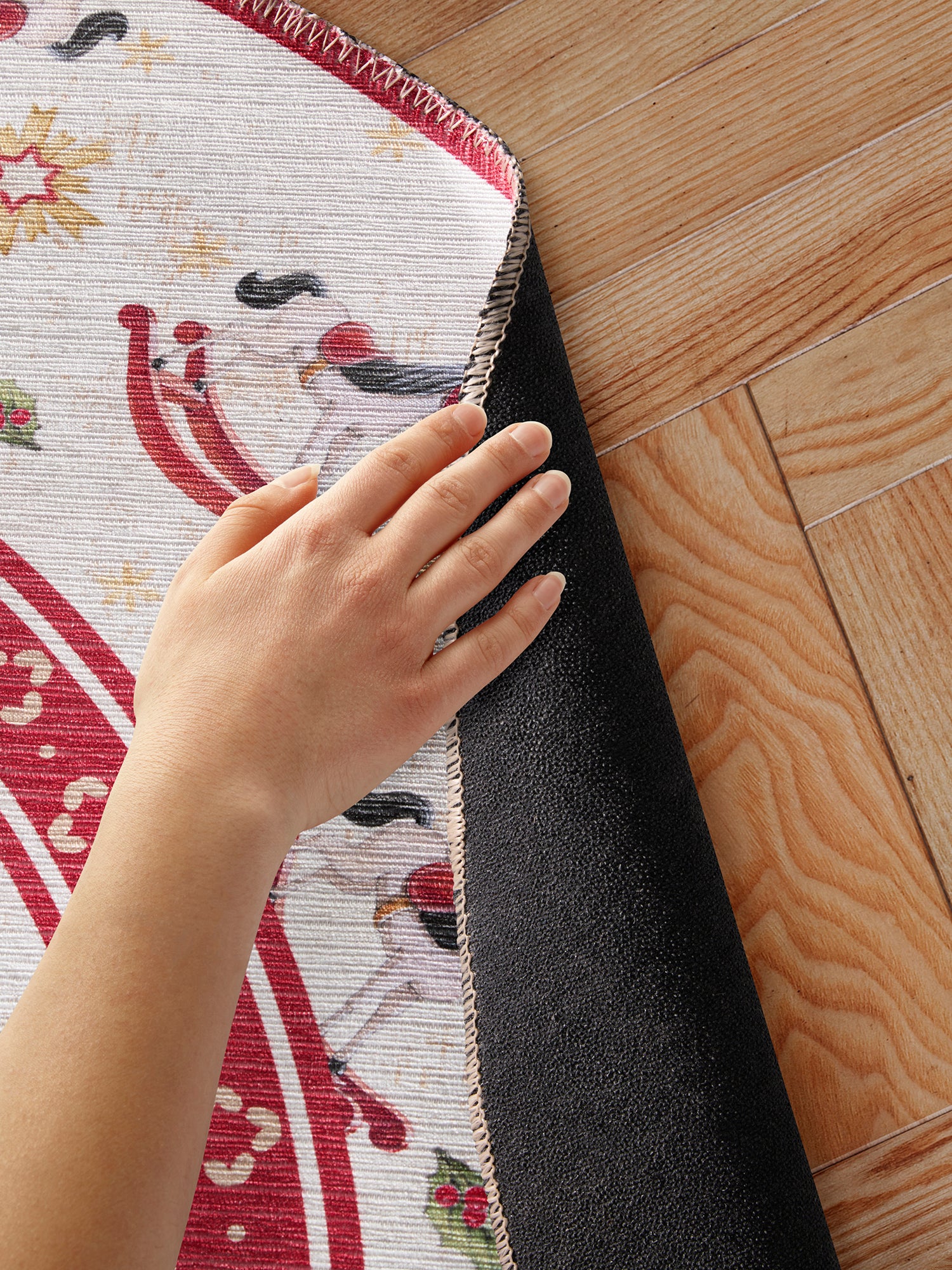 Denna julmatta är tillverkad av mjuka och slitstarka polyesterfibrer, vilket ger den en lyxig, sammetslen yta och gör den enkel att rengöra för hand. Den halkfria PVC-strukturen på baksidan säkerställer att mattan håller sig på plats – perfekt för livliga juldagar och lek under granen.